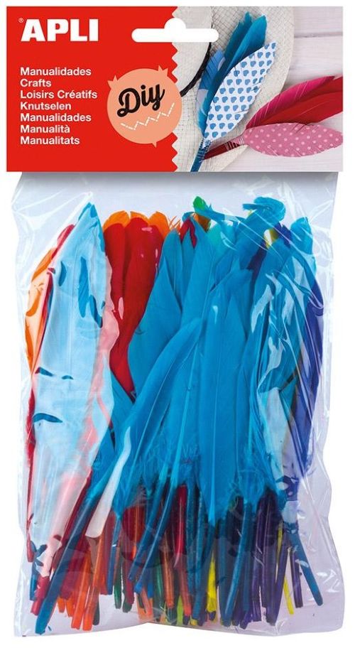 Descripción: Producto ideal para realizar todo tipo de manualidades. Plumas de colores surtidos, 100 u./bolsa: 2 tamaños diferentes de 7cm y 16cm. Colores: Amarillo, naranja, rojo, verde, azul oscuro y turquesa.