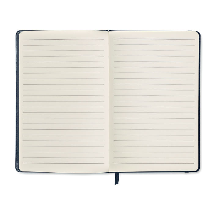Libreta A5 con tapa rígida de PU de tacto suave. 192 páginas (96 hojas) rayadas de papel reciclado. Banda elástica y marca páginas.