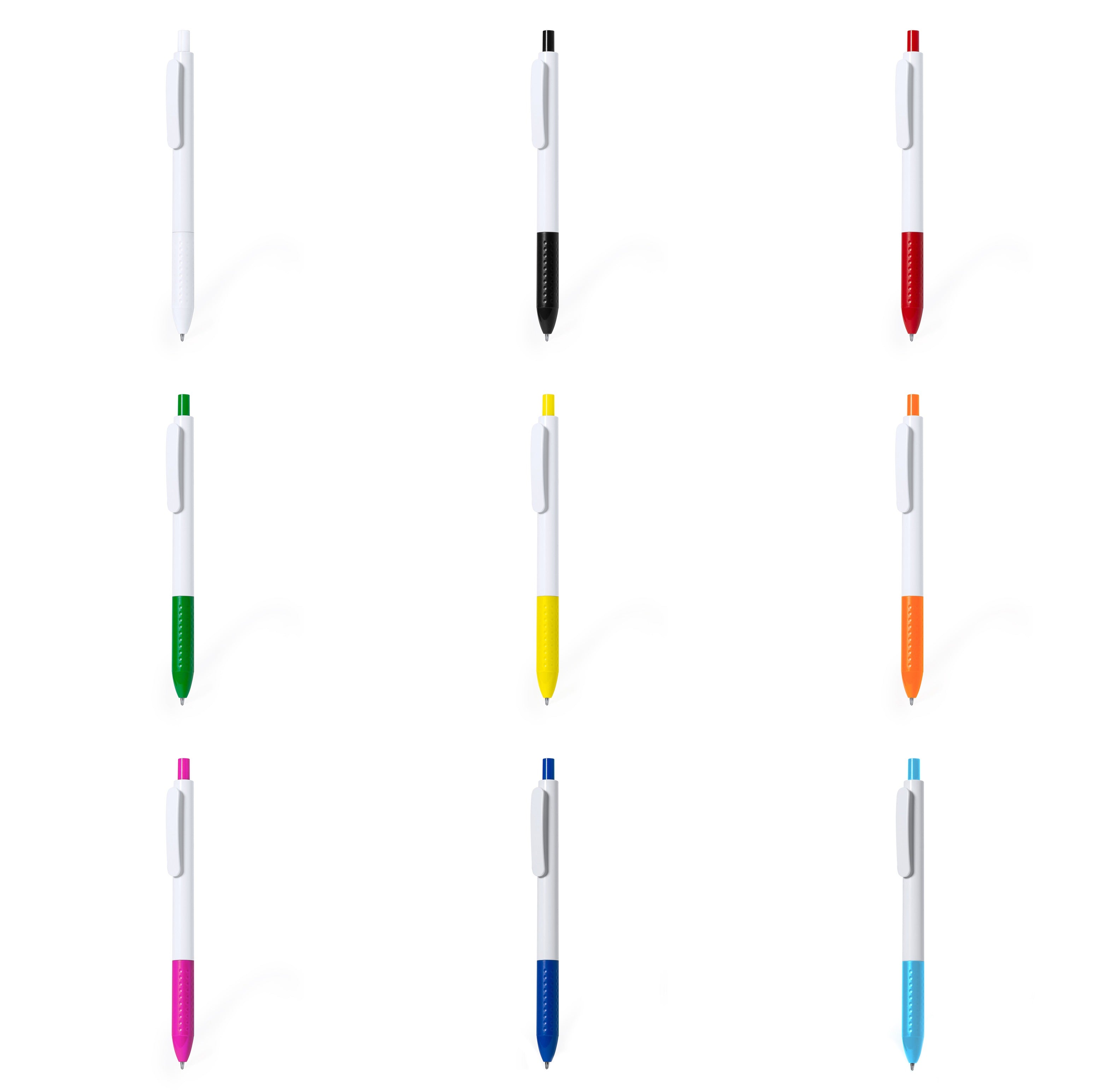 Bolígrafo de mecanismo pulsador en resistente ABS. Fabricado en elegante combinación de caña y clip de tono blanco. Con pulsador y empuñadura disponibles en una vibrante variedad de colores. En tinta azul.
