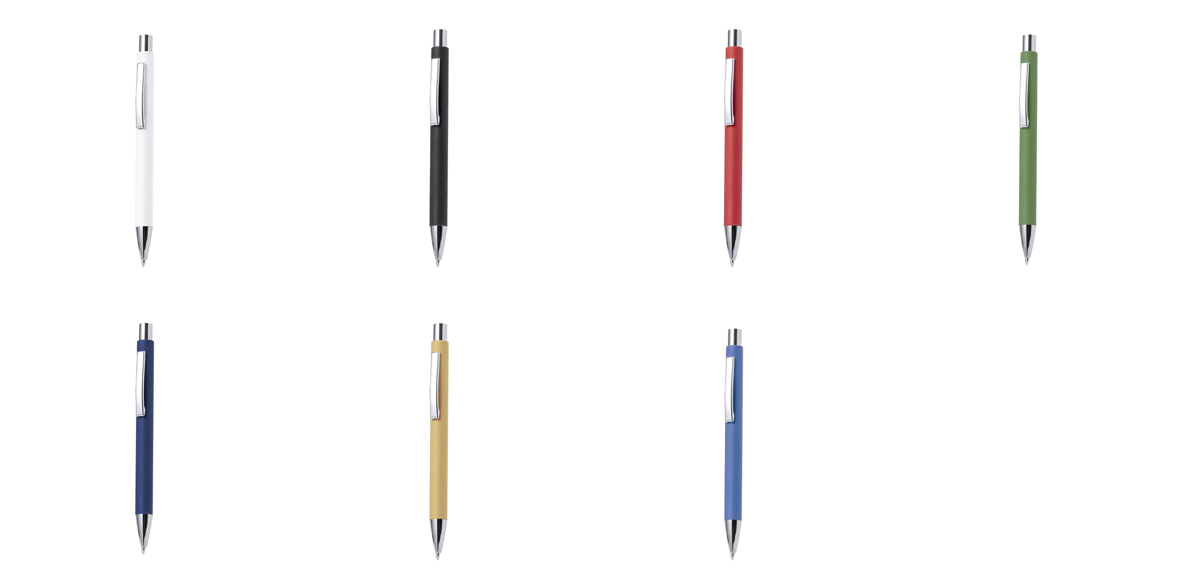 Elegante bolígrafo de mecanismo pulsador con cuerpo en papel reciclado y accesorios de acabado metálico en color plateado brillante. De tinta azul. Disponible en variada gama de colores.