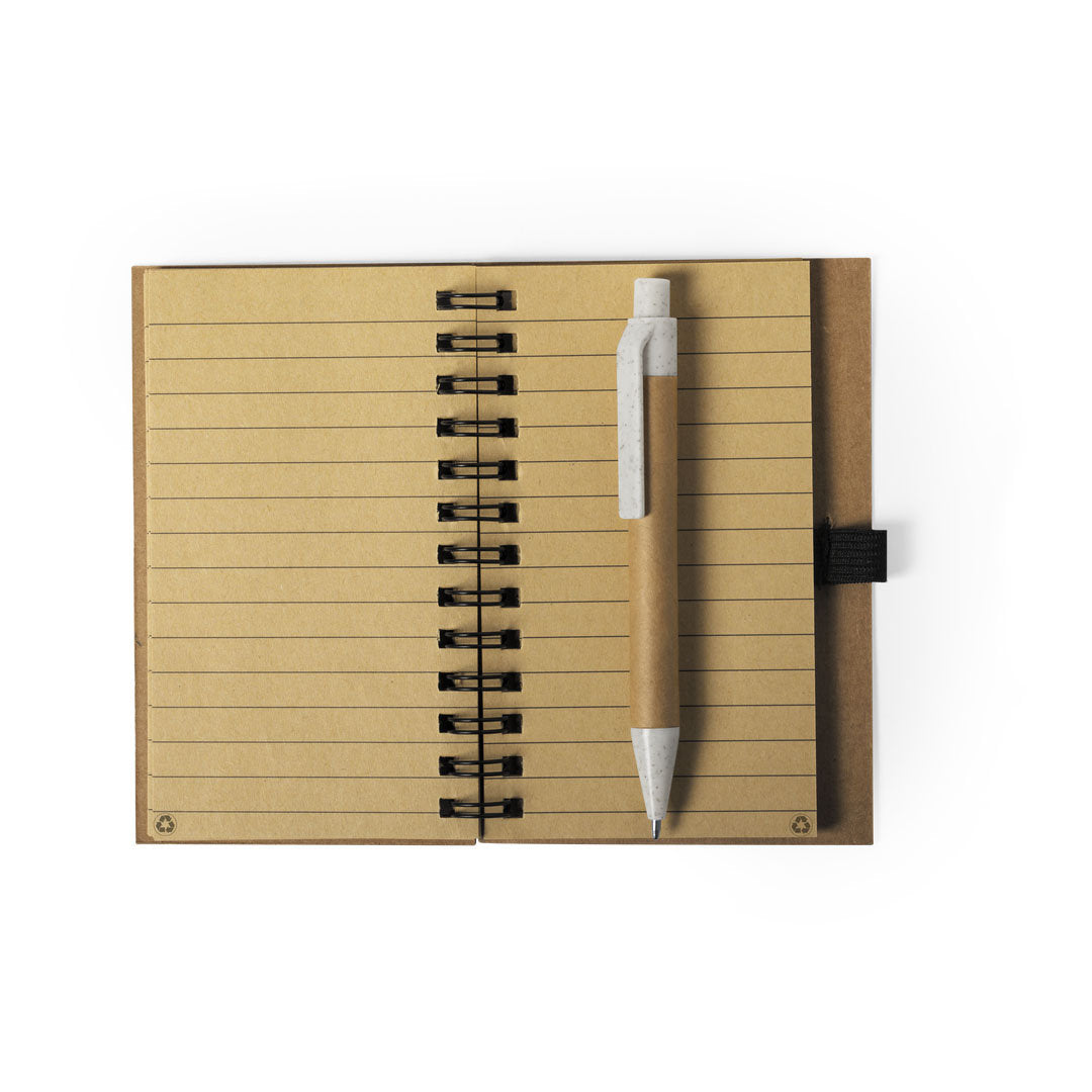 - Ecológica: Libreta de tapas de corcho y cartón reciclado con bolígrafo sostenible.