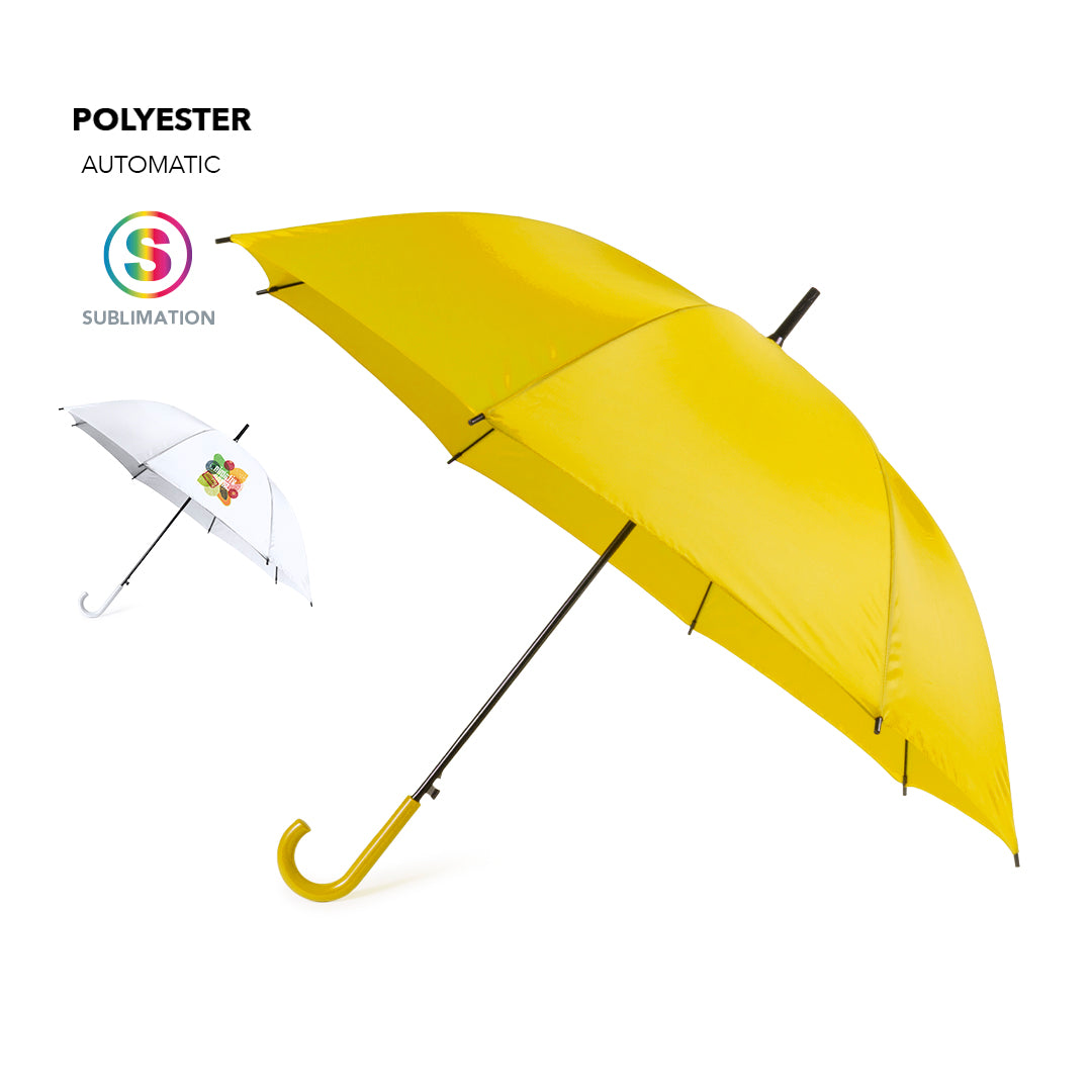 Paraguas de 8 paneles en extensa gama de vivos colores y 105cm de diámetro. De apertura automática, en resistente material poliéster, con varillas metálicas en color negro y mango a juego.